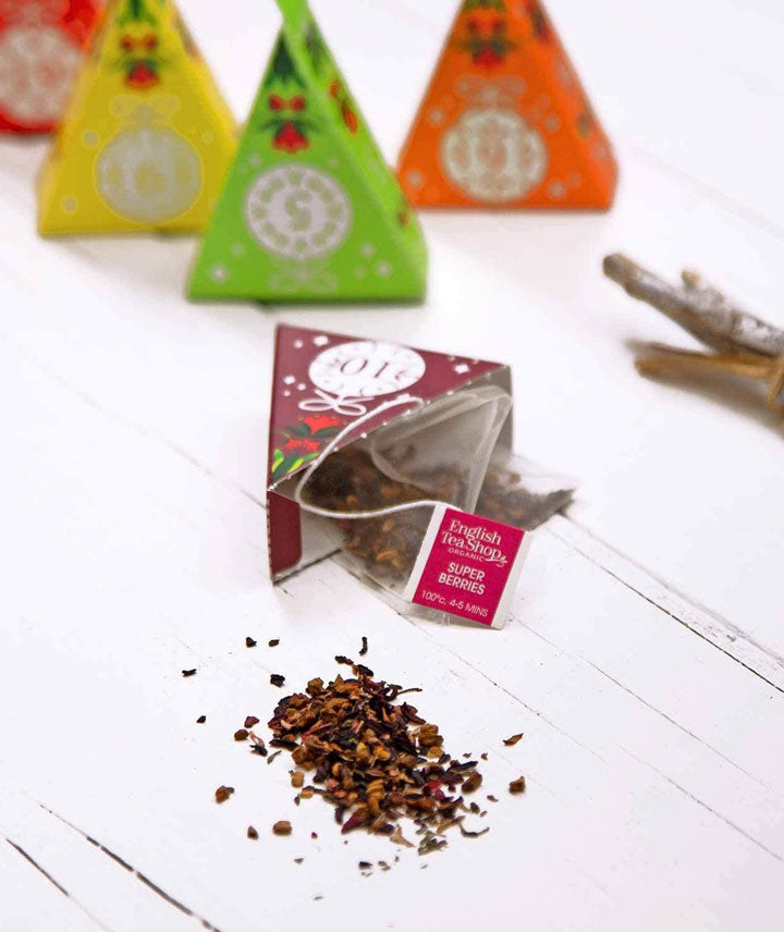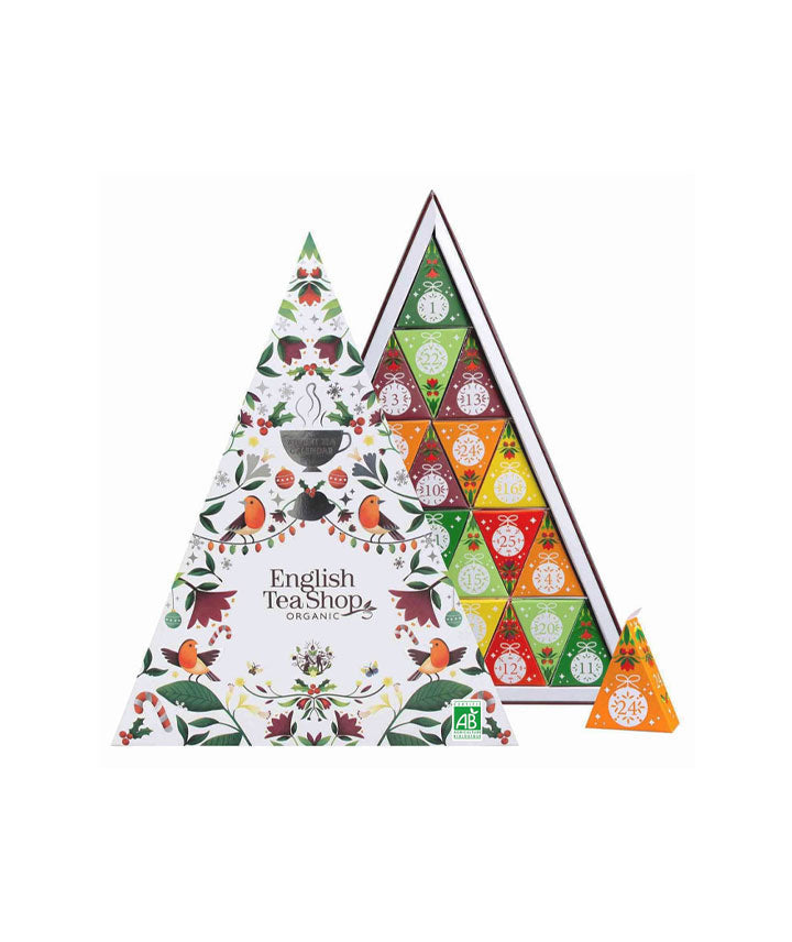 The English Tea Shop propose un calendrier de l’Avent thés et infusions bio, présenté dans 25 cônes numérotés pour découvrir un thé différent chaque jour. L’assortiment combine 13 thés et infusions bio, parfaits pour l’hiver : thés noirs intenses, thés verts délicats, infusions fruitées et épicées, toutes en sachets pyramides pour préserver la qualité et les arômes des feuilles entières.
